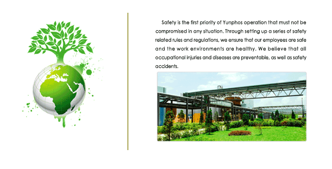 Safety is the first priority of Yunphos operation that must not be compromised in any situation. Through setting up a series of safety related rules and regulations, we ensure that our employees are safe and the work environments are healthy. We believe that all occupational injuries and diseases are preventable, as well as safety accidents.